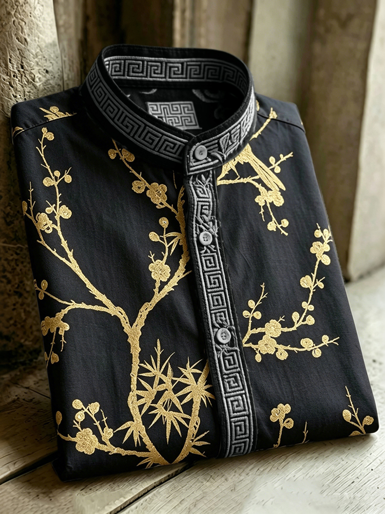 Vintage-style Cherry Blossom And Crane Traditional Embroidery Art Tie-dye Open-front Long Sleeve Shirt