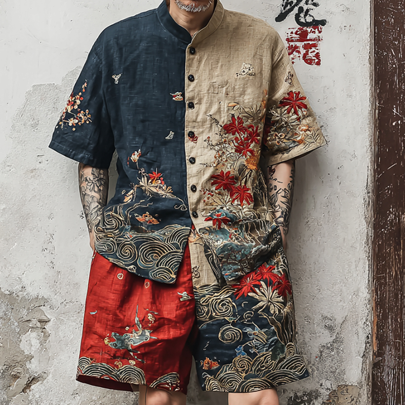 Japanese-style Flying Crane And Cloud Pattern Color-blocked Two-piece Set